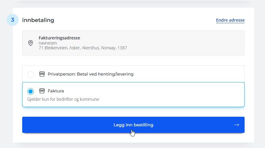 Til slutt velger du ønsket betalingsmåte. For privatpersoner gjelder kun betaling ved henting/levering. For bedrifter og kommuner, kan de velge faktura.
