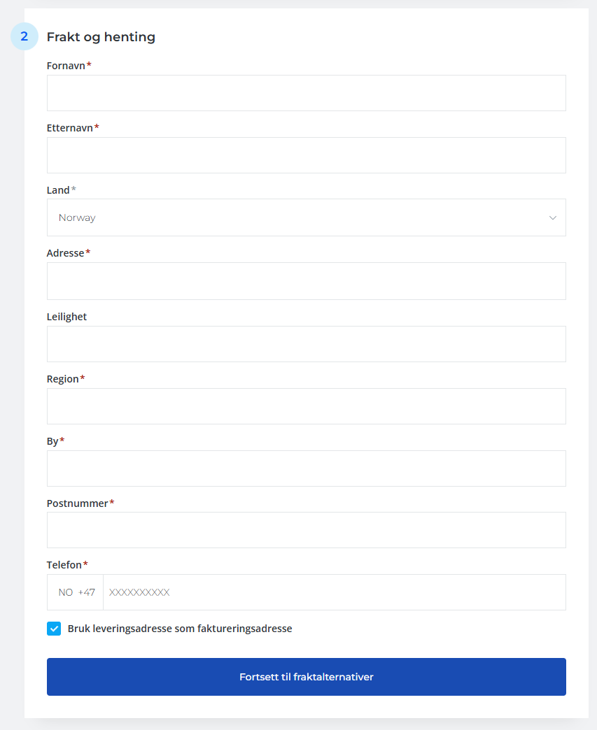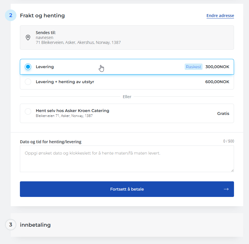 Under Frakt og henting fyller du ut navn og adresse + telefonnummer. Dette gjør du uansett om du har tenkt til å få maten levert eller hente den selv (du velger dette på neste steg).