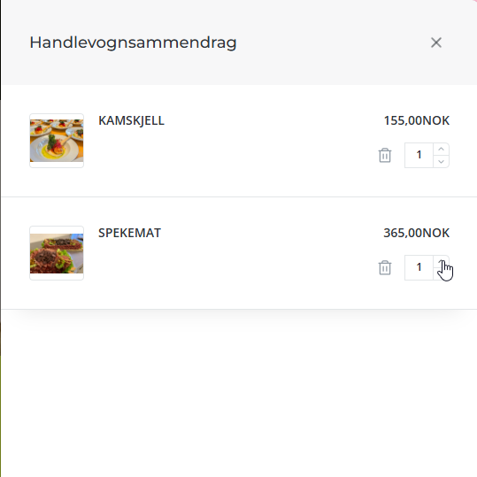 Handlekurven vil dukke opp på høyre side av skjermen i det du legger noe i handlekurven. Her vil du se alt du har lagt i handlekurven, og her kan du justere hvor antallet du ønsker av hver rett.