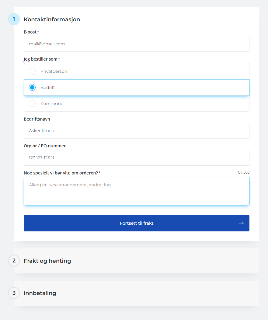 Nå fyller du ut litt informasjon. Fyll inn mailen vi kan kontakte deg på. Velg om du bestiller som privatperson, bedrift eller kommune. Dersom du bestiller som bedrift må du fylle inn bedriftsnavn og Org nr. Bestiller du som kommune fyller du ut PO nummer. Som privatperson kan du hoppe over disse feltene. Nederst fyller du inn om det er noe spesielt vi trenger å vite om orderen. Om det er allergier vi skal ta hensyn til, eller om det er til et spesielt arrangement.